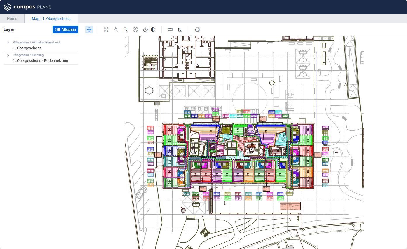 Zum ersten Mal wird ihr dabei auch klar, dass es nicht nur um Ablage geht. In Campos Plans besteht die Möglichkeit, DWG- und PDF-Pläne durch die ICFM AG professionell aufbereiten und laufend nachführen zu lassen. Aktuelle DWG-Pläne können dabei auch mit Haustechnikplänen gemischt werden. So entsteht eine konsistente, aktuelle Planbasis – unabhängig davon, aus welchen Quellen die Daten ursprünglich stammen. Und das alles, ohne ein Programm lokal installieren oder CAD-Lizenzen erwerben zu müssen!